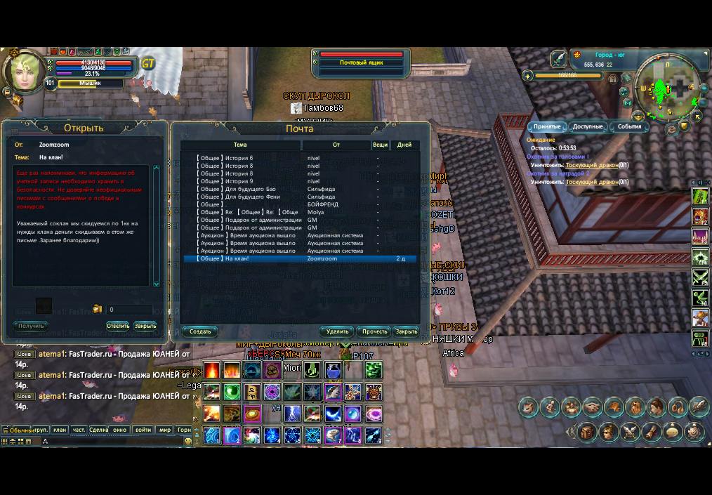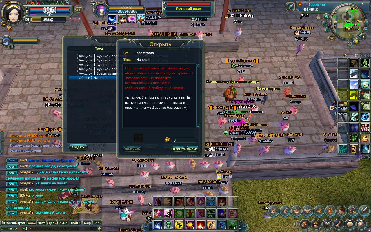 Клан 1. Вас приглашают в клан и просят немного денег на его развитие или эмблему. Через какое-то время этот клан распустят или просто забудут о нём. Как правило в таких кланах сплошь игроки низких уровней и ничтожно мало средних или высоких.<br> <br> 2. Вам предлагают купить клан или должность в клане. Для отвода глаз вас могут сразу назначить маршалом, а когда заплатите просто выкинут вас или распустят клан.<br> <br> 3. В клан пришёл новый никому не знакомый игрок и в первые же дни он просит в долг что-либо дорогое, в том числе и деньги, или обращаясь в ПМ к каждому выспрашивает и просит в долг что-нибудь более менее ценное либо денег. Предложения пойти помочь ему, чтобы скрафтить или заработать он всячески отклоняет. Получив приличную куш разом или то всех понемногу и спустя несколько часов вы скорее всего не увидите его в клане. 4. Ваш соклан/друг недавний предлагает вытащить вам из шопа вещи для одного человека и говорит, что тот готов заплатить за них больше. Когда вы вытащите соклан/друг-посредник попросит дать ему вещи чтобы показать их тому челу. Потом соклан/друг-посредник скажет, что тот чел захотел еще несколько вещей, иначе он первые не возьмет без них. После того, как соклан/друг-посредник всё у вас заберёт он скажет, что он за деньгами, подожди. Ждать вы будете еще очень долго. А соклан/друг-посредник будет долго говорить, что его самого кинули и вещи забрали и он тоже как вы попался. В итоге вы потеряете деньги. 5.1. Мошенник создает ник, максимально похожий на ник мастера клана и пишет с этого ника по внутренней почте письмо одному из игроков этого клана с предложением отправить ему вещи для их улучшения за счёт клана. Иногда даже к этому письму прилагаются юаньки на оплату пересылки. Если отправите вещи - больше никогда их не увидите, потому что уходят они отнюдь не вашему мастеру, который об этом ни сном ни духом не подозревает. 5.2. Мошенник создает ник, максимально похожий на ник одного из участников клана и пишет с этого ника по внутренней почте письмо кому-нибудь из игроков этого клана с просьбой одолжить поносить что-либо на время. В итоге вы просто подарите мошеннику переданные вещи. Итак, попав в новый, малоизвестный клан присмотритесь к нему и не спешите сразу же отдавать деньги. НИКОГДА не пытайтесь купить должность в клане или сам клан и не поддавайтесь на подобные предложения. НИКОГДА не торгуйте через посредника, кем бы он вам не приходился. ВСЕГДА будьте внимательны при просьбах в ПМ яко бы от соклана/друга, передать ему вещи зачем-либо: обращения друзей в ПМ высвечиваются розовым, а не синим, в случае с сокланом просто перейдите в клан чат и убедитесь, что говорите с сокланом, а не с кем-то другим. При обращении через ящик НИКОГДА не пересылайте вещи не убедившись, что просьба действительно от соклана/друга. При просьбе в ПМ от новенького соклана об одолжении чего-либо постарайтесь ещё до того как решите дать ему что-либо выяснить, не спрашивал ли он у ваших сокланов что-нибудь в долг.