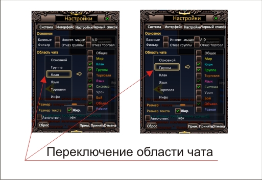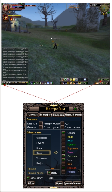 В области чата "Язык" поставить галки на "Система", " Урон", "Общее"